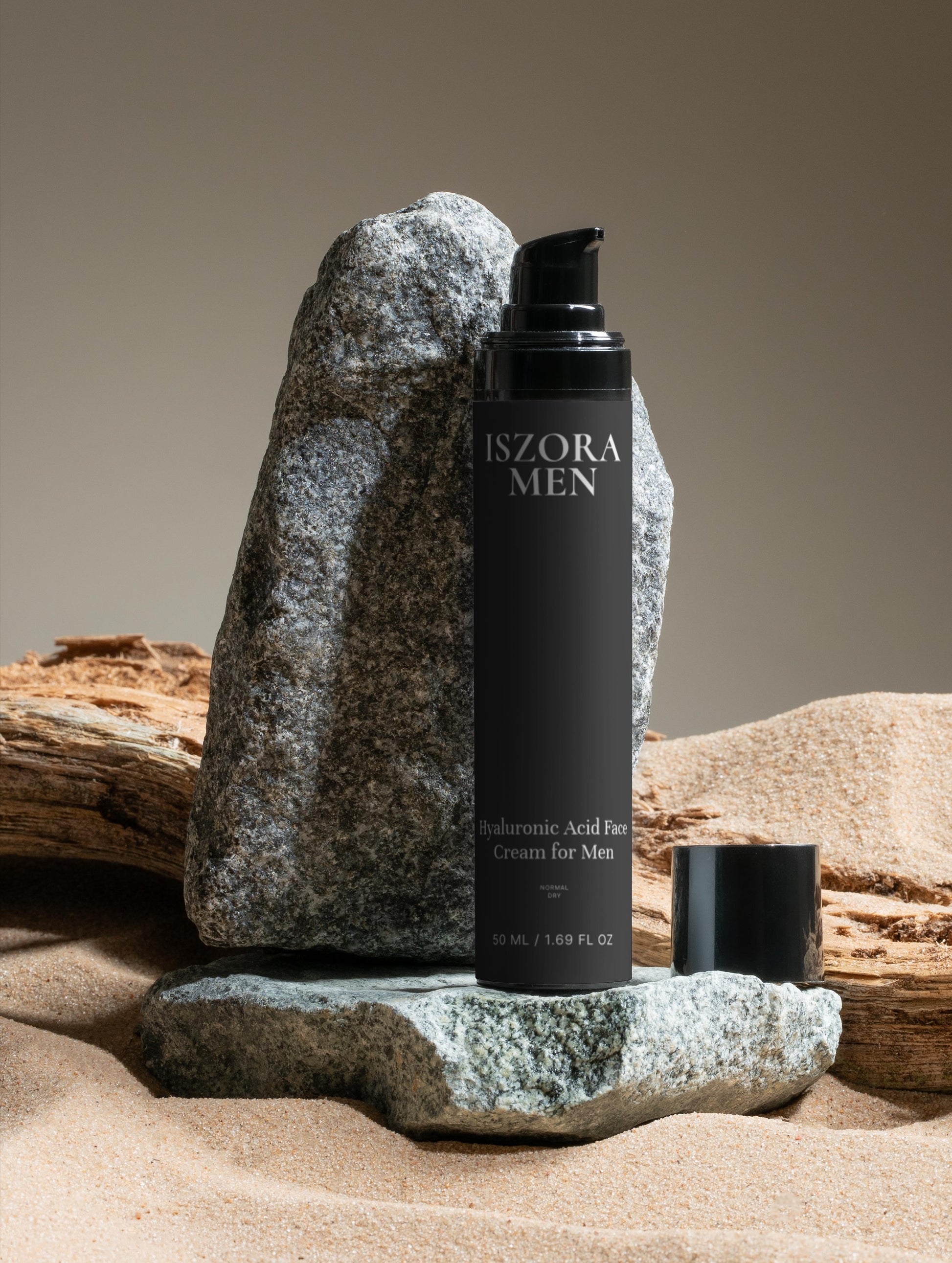 Air conditionné de la cabine, eau calcaire des hôtels, rasages fréquents — la peau masculine est fragile.